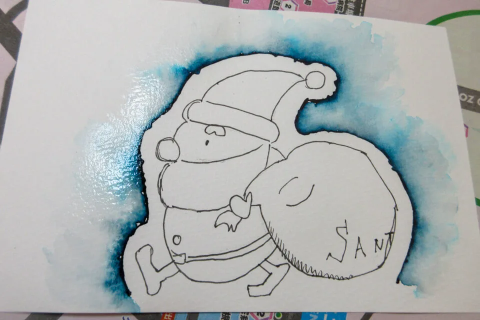 サンタさんの周りをこの青でにじませていたら、深海みたいでもあり、真っ青な空みたいでもあり、ちょっと曇り空にも見える。水の動き次第でコントロール不能。でもそこが最高!