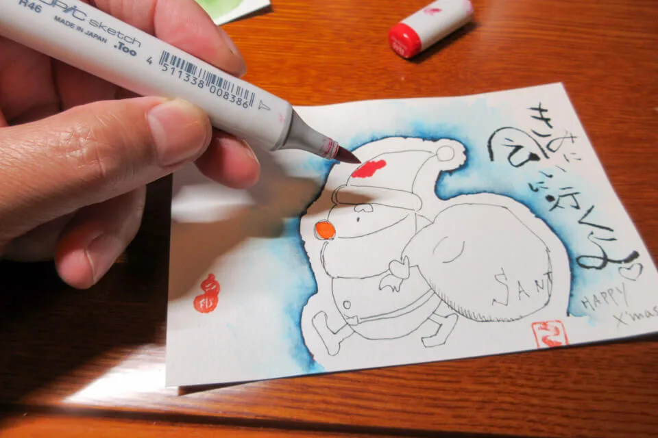 そう思って、赤い部分は別の画材に挑戦してみることにした。水彩じゃなく、あえてコピックを使ってみたんだ。