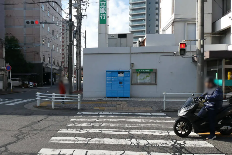 場所は、銀行の敷地のすみっこ。水色のAmazonロッカーがひっそりとたたずんでいる。