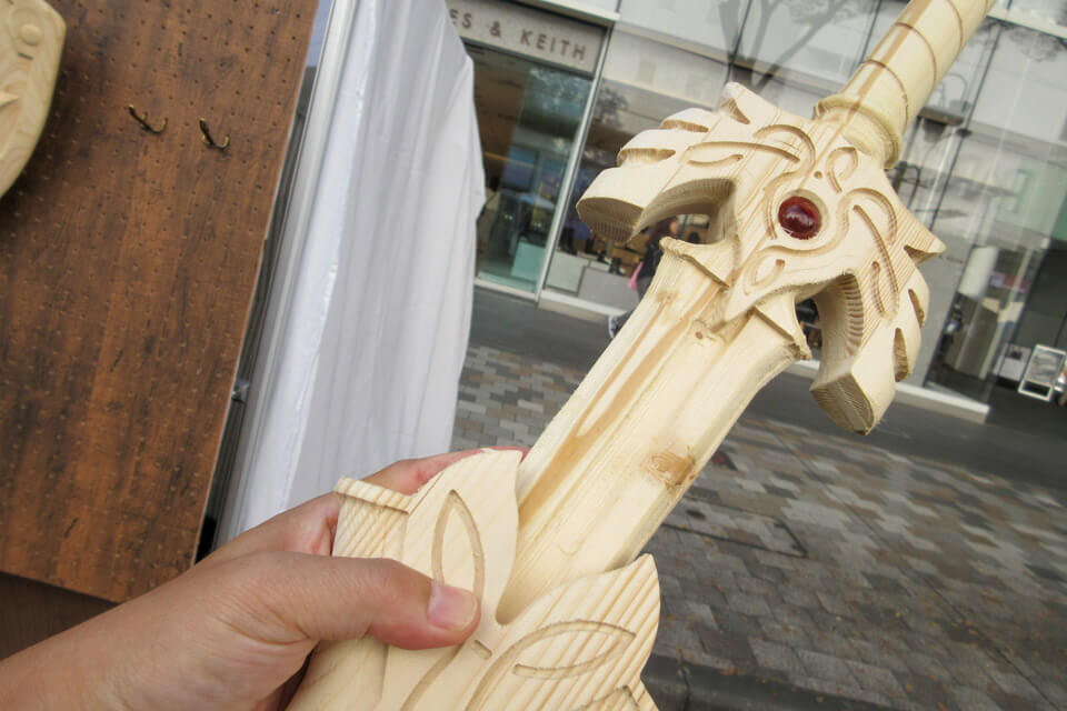 勇者の剣とか盾とかが木で作られてて、思わず剣を手に取ってみたんだ。木だからズシッとはしないのに、しっかりした作り。