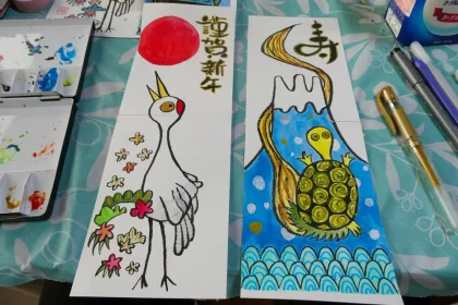 縦二連の気持ちよさ!鶴と亀の年賀状——己書の2時間没頭