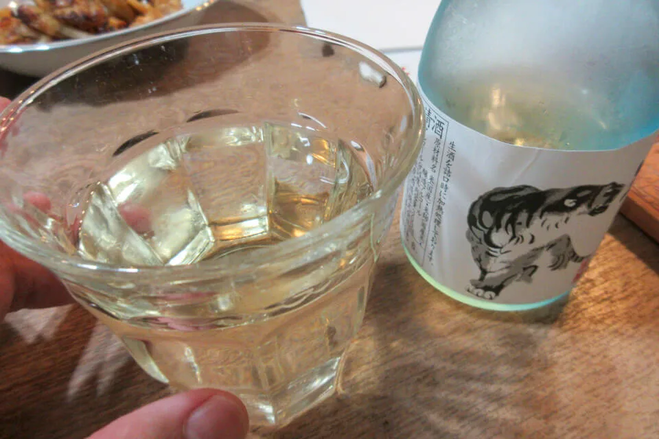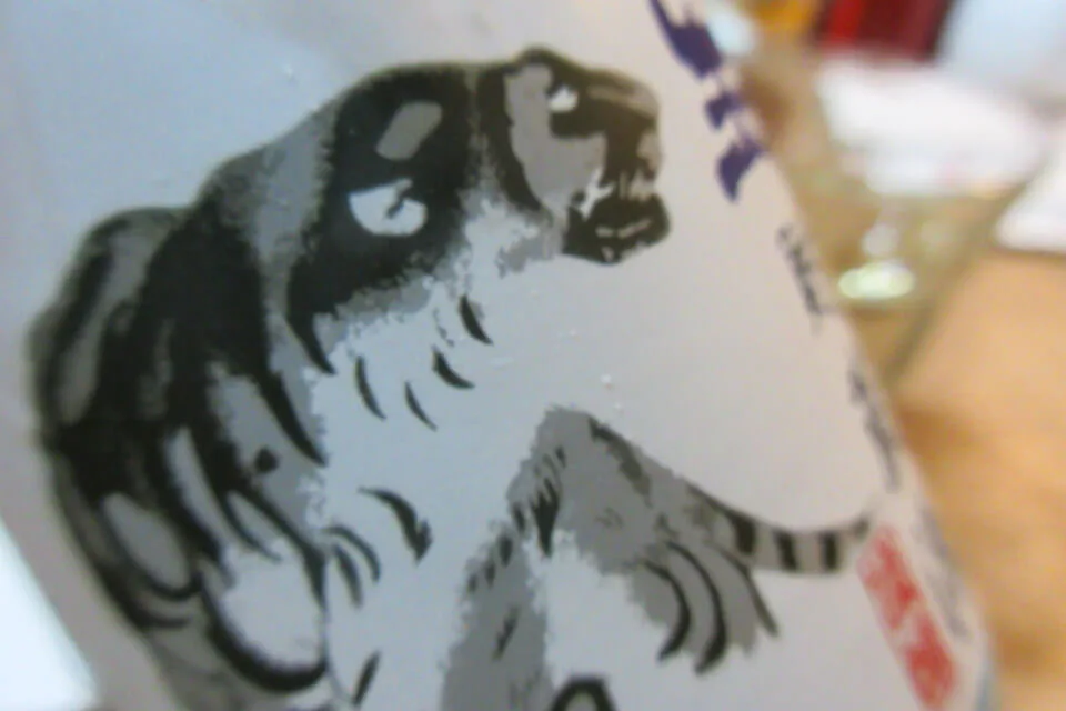 透明な瓶に白いラベル。そこには、墨で描かれた力強い虎がいた。