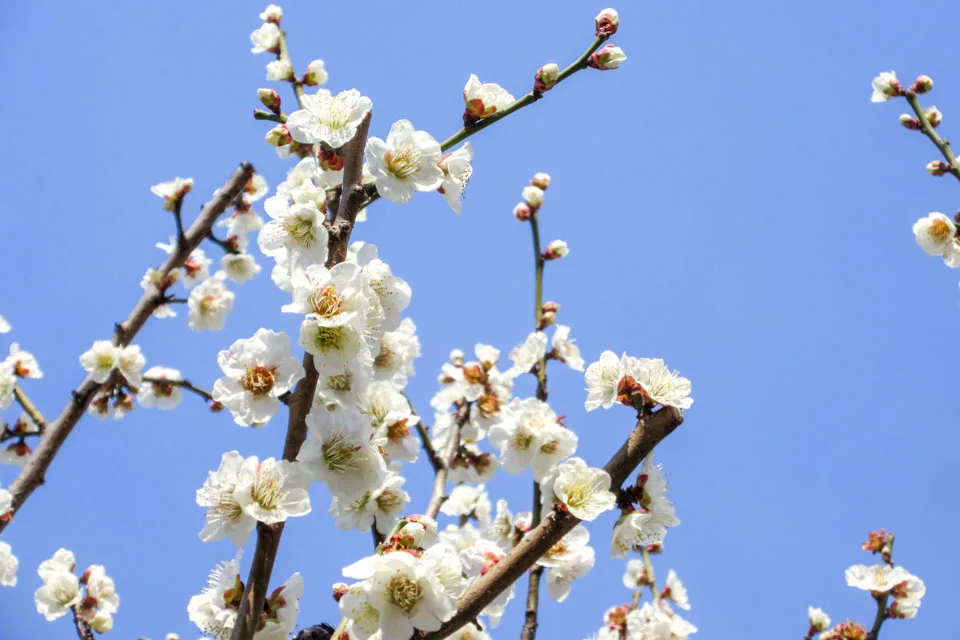 目を向けると、白やピンクの梅の花が、まるで春の雲みたいにふんわりと枝を包み込んでいる。